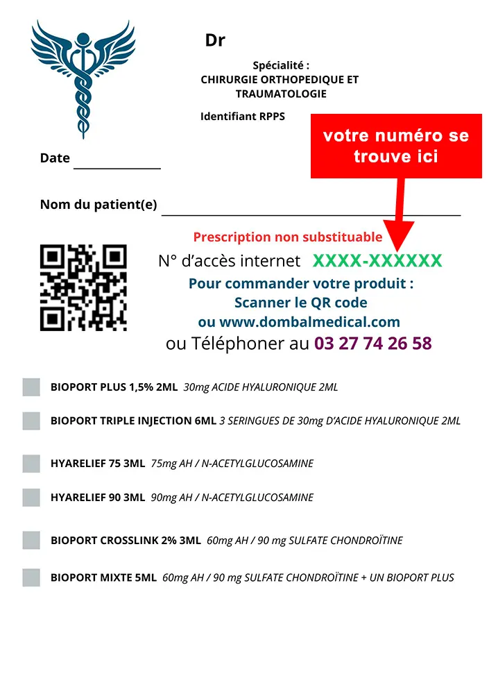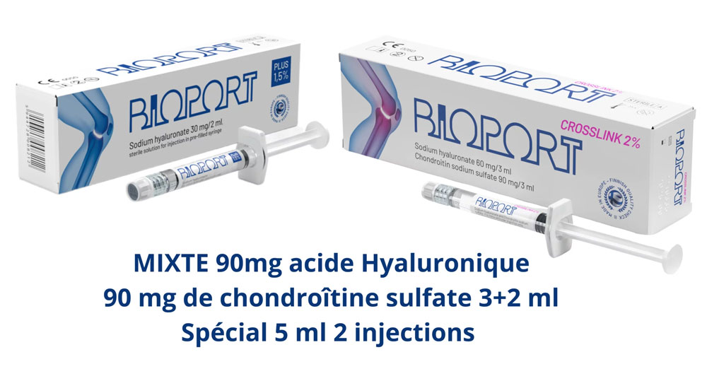 Acide Hyaluronique MIXTE BIOPORT CROSSLINK 169,00 € Composition : AH 100 % naturel + Chondroïtine sulfate Concentration : 90 mg d’AH + 90 mg de chondroïtine sulfate / 5 mL Présentation : 1 seringue de 3 mL + 1 seringue de 2 mL Poids moléculaire : ~3 MDa - Élasticité : 468 Pa (2,5 Hz) - Viscosité : 220 Pa·s (2,5 Hz) Indications : Douleurs modérées à avancées - Arthrose, inflammations chroniques - Prévention... Ajouter au panier